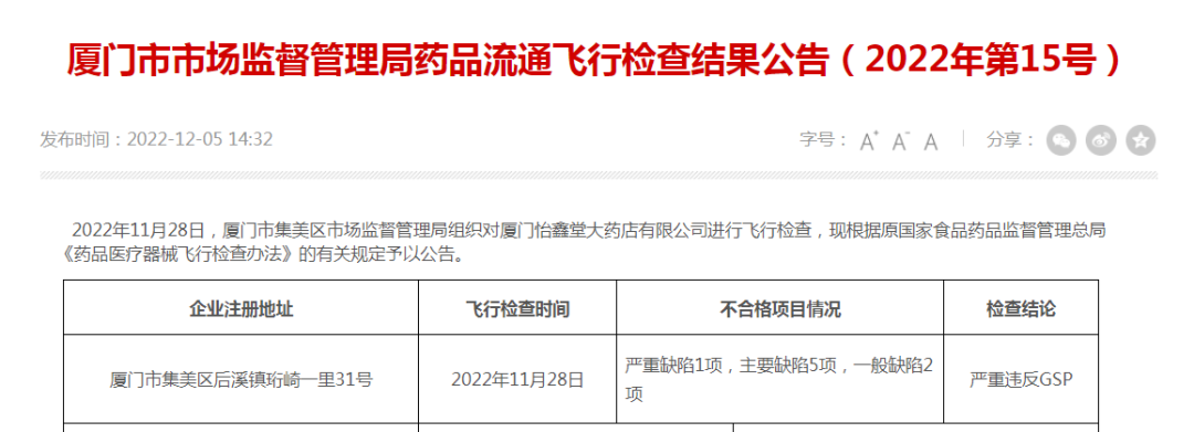 《公告》指出,2022年11月28日,廈門市集美區(qū)市場監(jiān)督管理局組織對廈門怡鑫堂大藥店有限公司進(jìn)行飛行檢查,發(fā)現(xiàn)其存在嚴(yán)重缺陷1項(xiàng),主要缺陷5項(xiàng),一般缺陷2項(xiàng)。